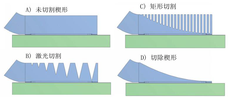 Arian Grams等人提出通過改變楔形焊點(diǎn)的結(jié)構(gòu)來提高鍵合可靠性,其利用激光對(duì)焊點(diǎn)進(jìn)行不同形式的切割,經(jīng)過一定時(shí)間的冷熱沖擊試驗(yàn)分別比較如圖8四種結(jié)構(gòu)的可靠性,試驗(yàn)表明形成獨(dú)立楔狀的D結(jié)構(gòu)可靠性相對(duì)于其它三種要更好。另外,Arian Grams對(duì)鍵合金屬線徑與鍵合可靠性之間的關(guān)系也有一定研究,其通過試驗(yàn)驗(yàn)證了在傳統(tǒng)封裝工藝流程中,線徑越大,造成失效的風(fēng)險(xiǎn)就越高[19-20]。