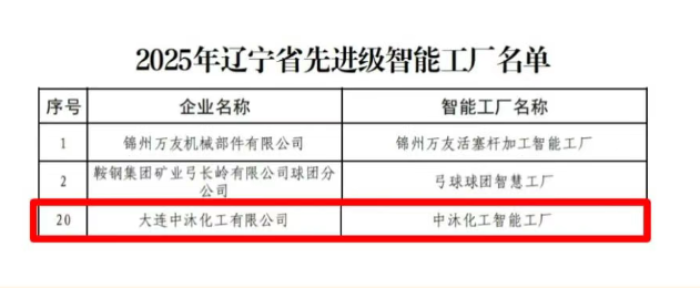 近日,省工信廳網(wǎng)站發(fā)布“2025年遼寧省數(shù)字化車間、先進(jìn)級智能工廠”擬定名單公示,大連中沐化工有限公司中沐化工智能工廠位列其中,擬獲得省先進(jìn)級智能工廠認(rèn)定